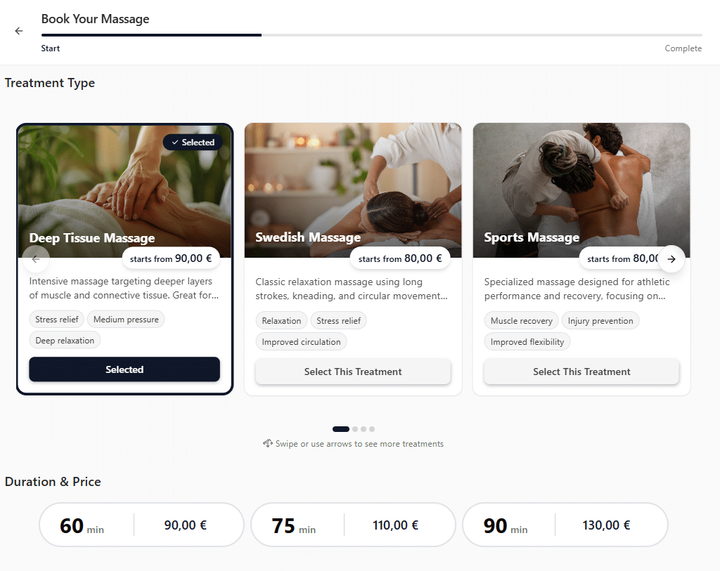 Reservas no próprio dia, cancelamentos gratuitos e a serenidade que permanece muito depois da sua sessão de spa. Sem trânsito, sem deslocações, só puro relaxamento.